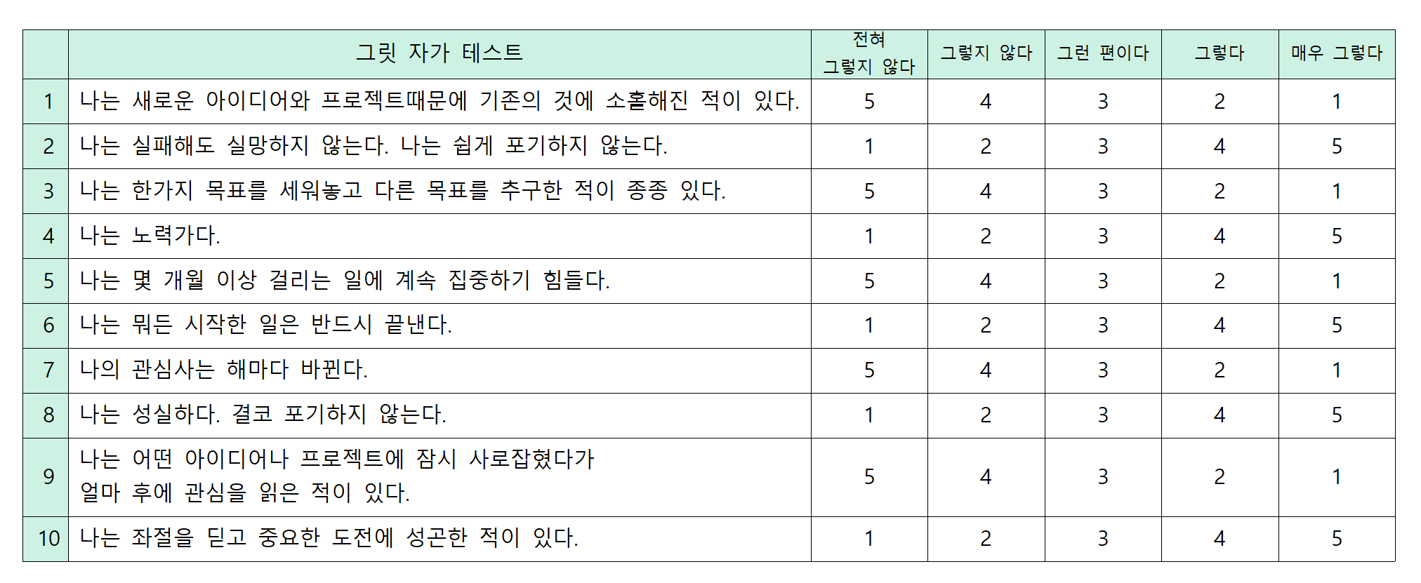 | 그릿 자가 테스트 문항 |
