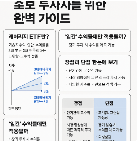 레버리지 ETF에 관심이 생겼나요? 하루아침에 수익률이 몇 배로 튀는 ‘고위험·고수익’ 투자 상품으로, 단기 트레이더들에게는 매력적인 도구입니다. 하지만 구조가 복잡하고 위험이 큰 만큼, 시작하기 전 확실한 이해가 필요합니다. 오늘은 초보 투자자도 쉽게 이해할 수 있도록 레버리지 ETF의 기본 개념부터 장단점, 주의할 점까지 자세히 알려드릴게요.