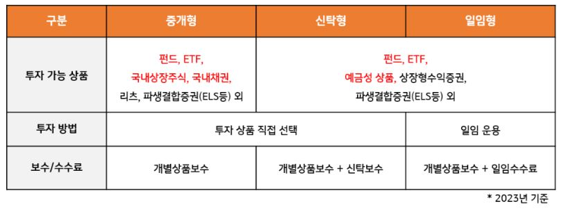 일임형, 신탁형, 중개형 등 다양한 유형이 있으며, 투자 상품과 수수료도 다릅니다.